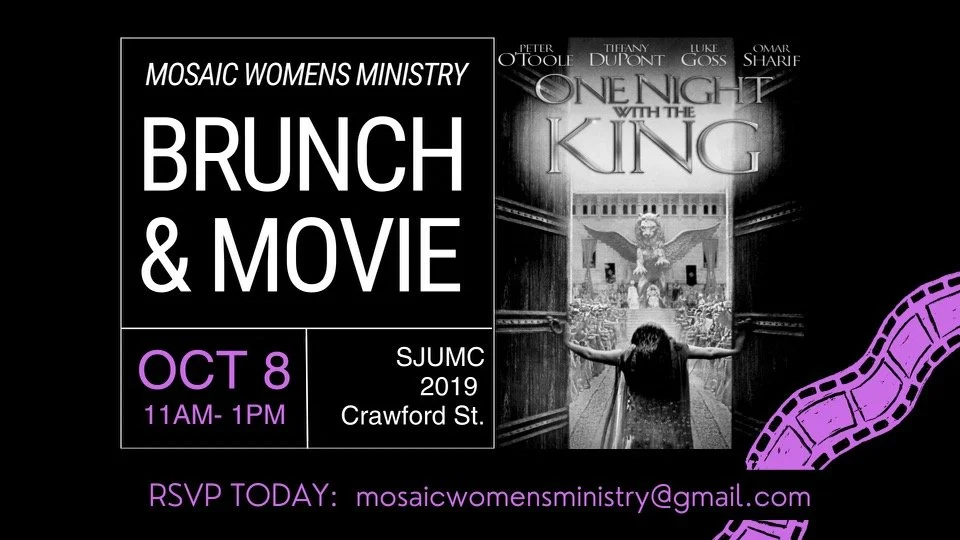 We are excited to invite you to our Mosaic Women Brunch And Movie Day happening this Oct. 8th from 11 am - 1 pm. We will be showing One Night With The King which will cover the story of Esther. Please sign up below if you will be in attendance! We look forward to seeing you there.